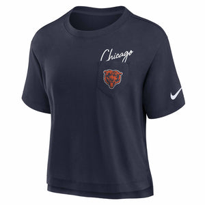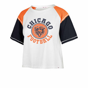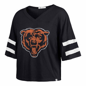 Pictured: Chicago Bears 47 Brand Women's Atlas Blue Premier Scout Crop Short Sleeve T Shirt
